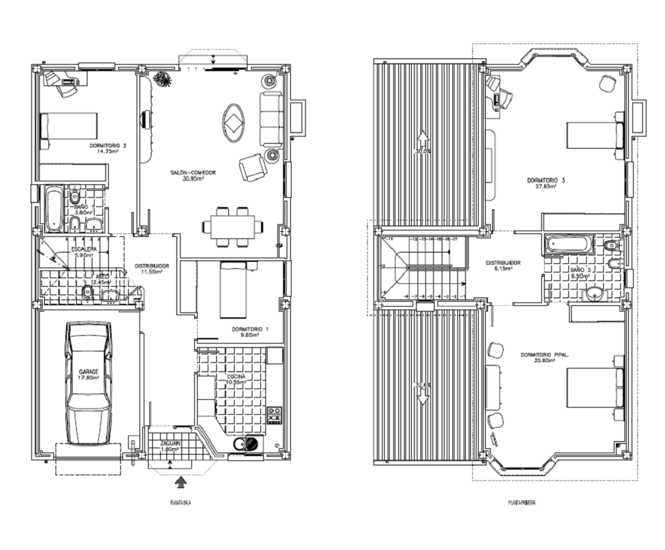 En planta primera nos encontramos con Dos habitaciones de 27,65 m² y 25,60 m² y un baño de 6,50 m².